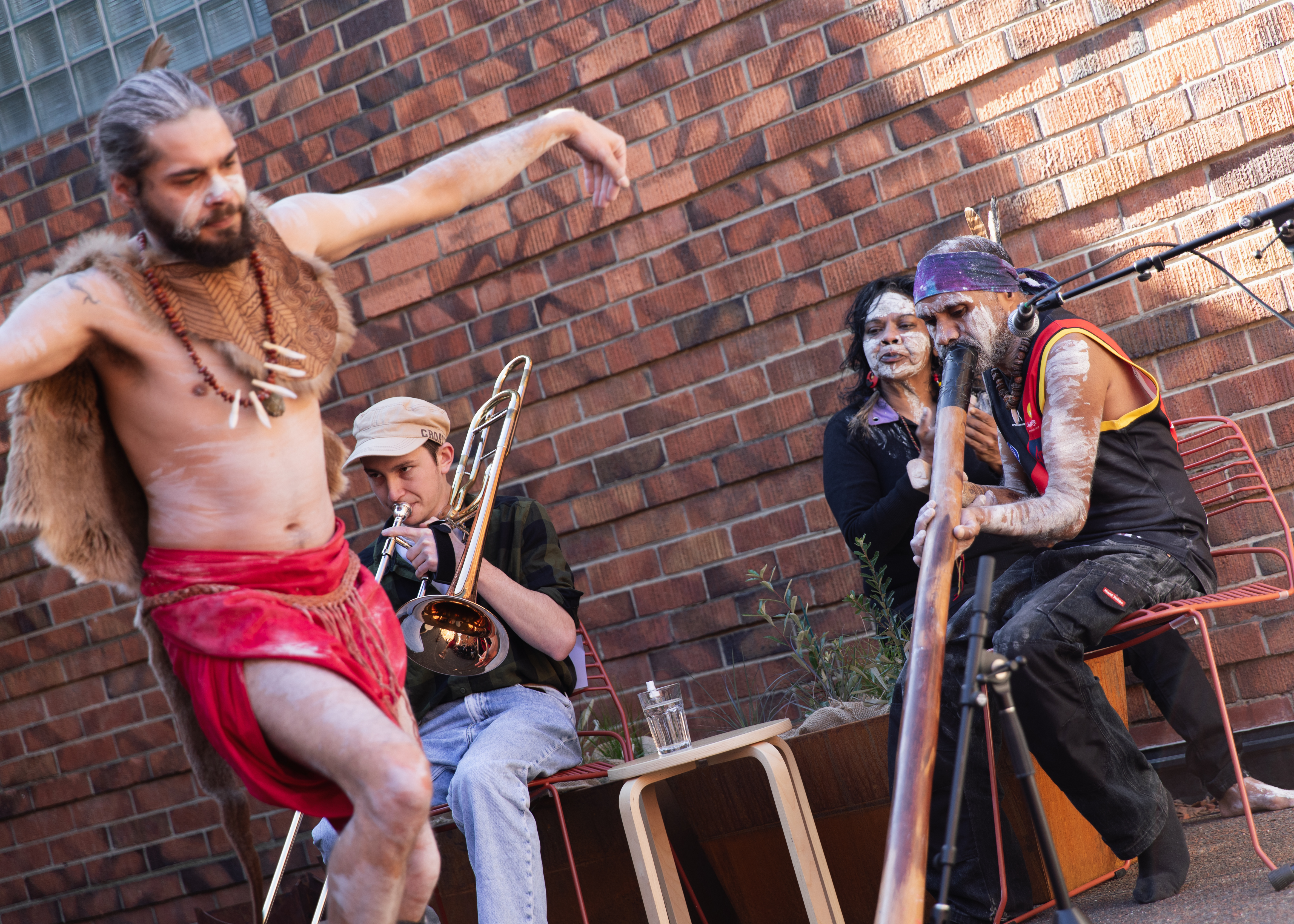 A few years later, I dedicated my Honours research project at Melbourne University towards better evaluating how my approach to Didgeridoo playing on the trombone fit (or didn’t) within current ethical and cultural frameworks. It was here I met musician, dancer, and proud Djab Wurrung/Gunditj Mara and Ngarrindjeri man, Amos Roach. Together we collaborated on a series of public performances that explored my ‘trombone-Didgeridoo’ approach, where I took on the role of a Didgeridoo student following and imitating the songs of the mentor. This finally gave me opportunities to explore my passion for Indigenous Australian music in practice, to consult knowledgeable cultural practitioners, and to genuinely interrogate my emerging role in this cross-cultural space.