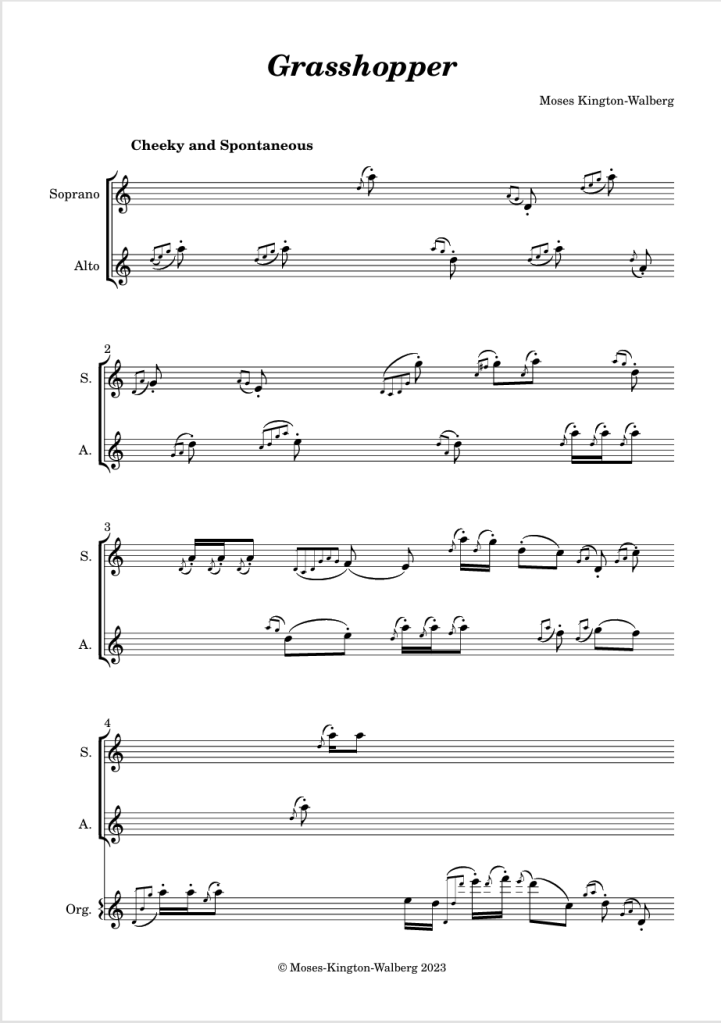 Grasshopper was written for Baroque Winds as part of the 2023 University of Melbourne chamber group exams. Scored for a historically informed wind ensemble in Valotti temperament.